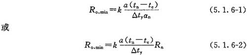 5.1.6 除外窗、陽(yáng)臺(tái)門和天窗外,設(shè)置全面供暖的建筑物,其圍護(hù)結(jié)構(gòu)的最小傳熱阻不得小于按下列公式計(jì)算所得值: