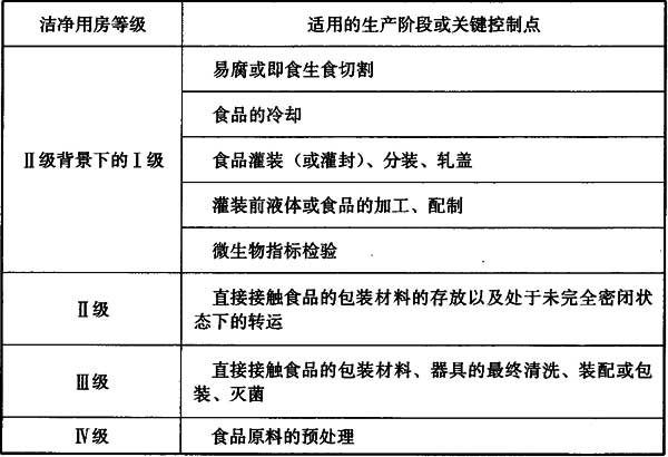 注:表中生產(chǎn)階段或關(guān)鍵控制點應(yīng)符合本規(guī)范表4.2.1的說明,具有高污染風(fēng)險,才適用Ⅱ級背景下的Ⅰ級(含設(shè)備自身具備的)的條件,如冷卻階段中的月餅、酸奶的冷卻,檢驗階段中的一般理化檢測則不適用此種條件。